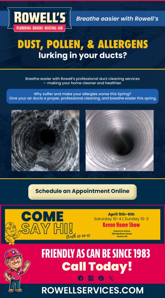"Friendly As Can Be Since 1983!" When you need help with your plumbing, drains, heating, cooling or electrical in Laconia, you can always rely on Rowell's Services! Call us now or book online!